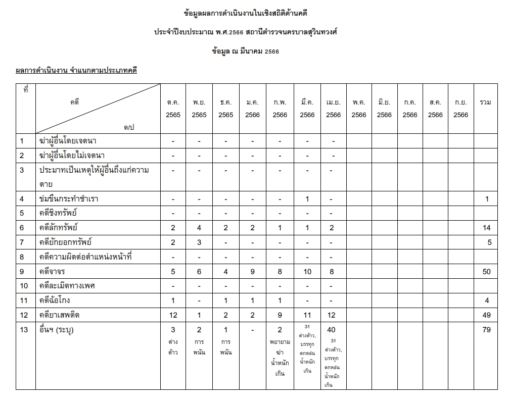 ข้อมูลรวมผลการดำเนินงานเชิงสถิติด้านคดี และ ข้อมูลผลการดำเนินงานในเชิงสถิติ การตั้งจุดตรวจ จุดสกัด ของสถานีตำรวจนครบาลสุวินทวงศ์ ประจำปีงบประมาณ 2566