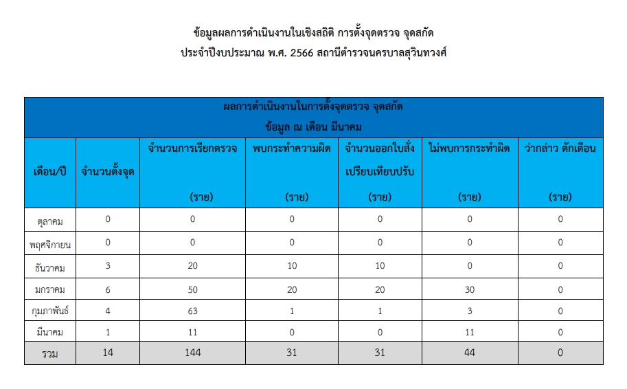 ข้อมูลผลการดำเนินงานในเชิงสถิติ การตั้งจุดตรวจ จุดสกัด ของสถานีตำรวจนครบาลสุวินทวงศ์ ประจำปีงบประมาณ 2566