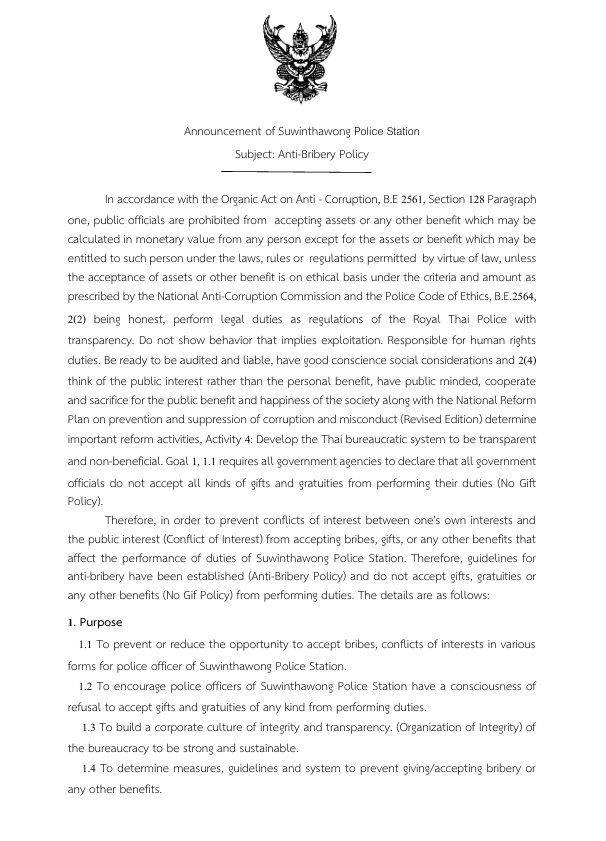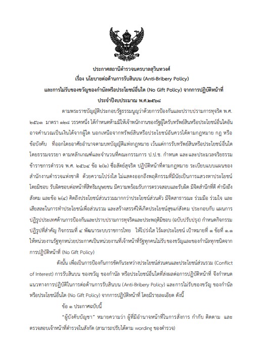 ประกาศ สถานีตำรวจนครบาลสุวินทวงศ์เรื่อง นโยบายต่อต้านการรับสินบน (Anti-Bribery Policy)